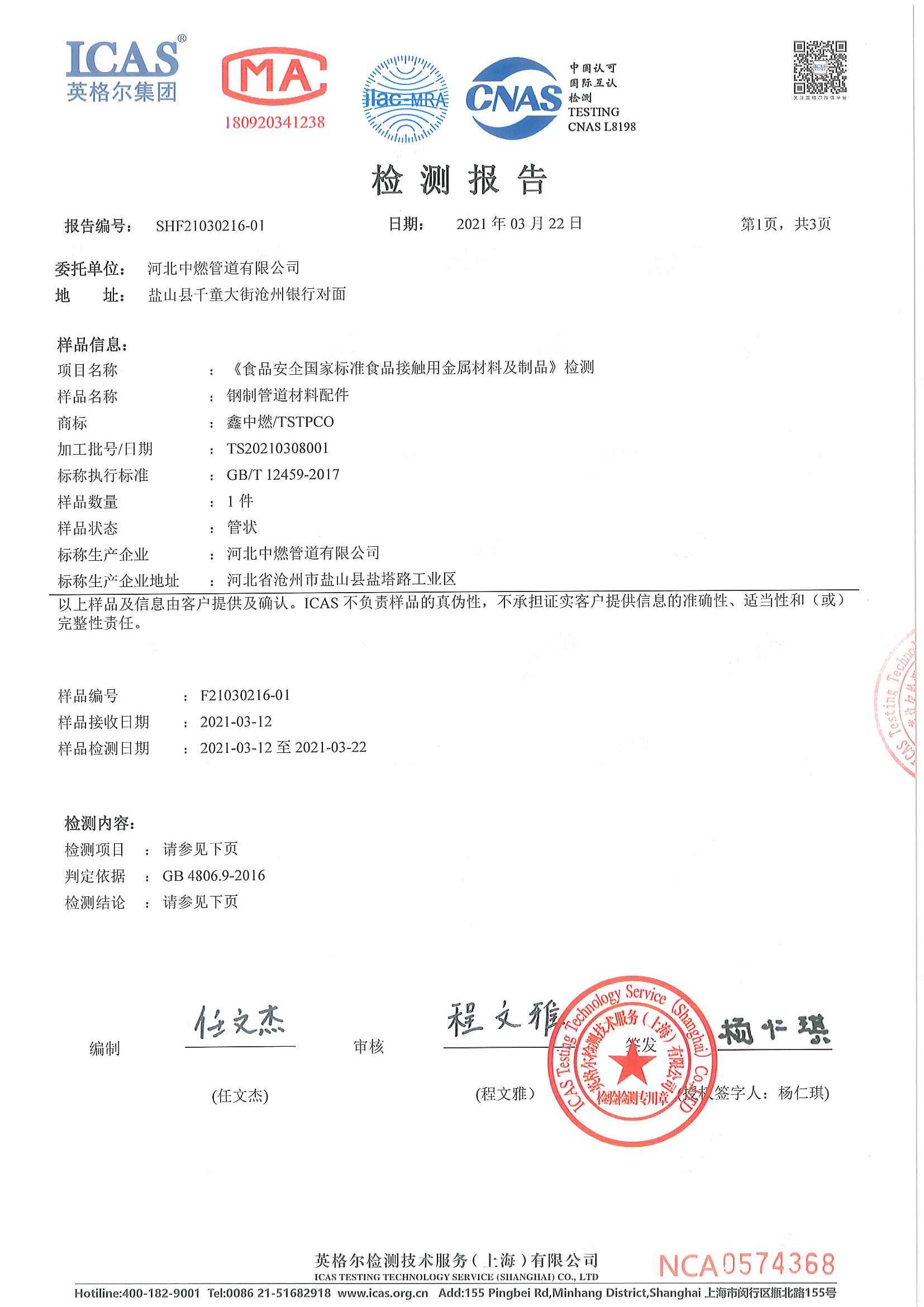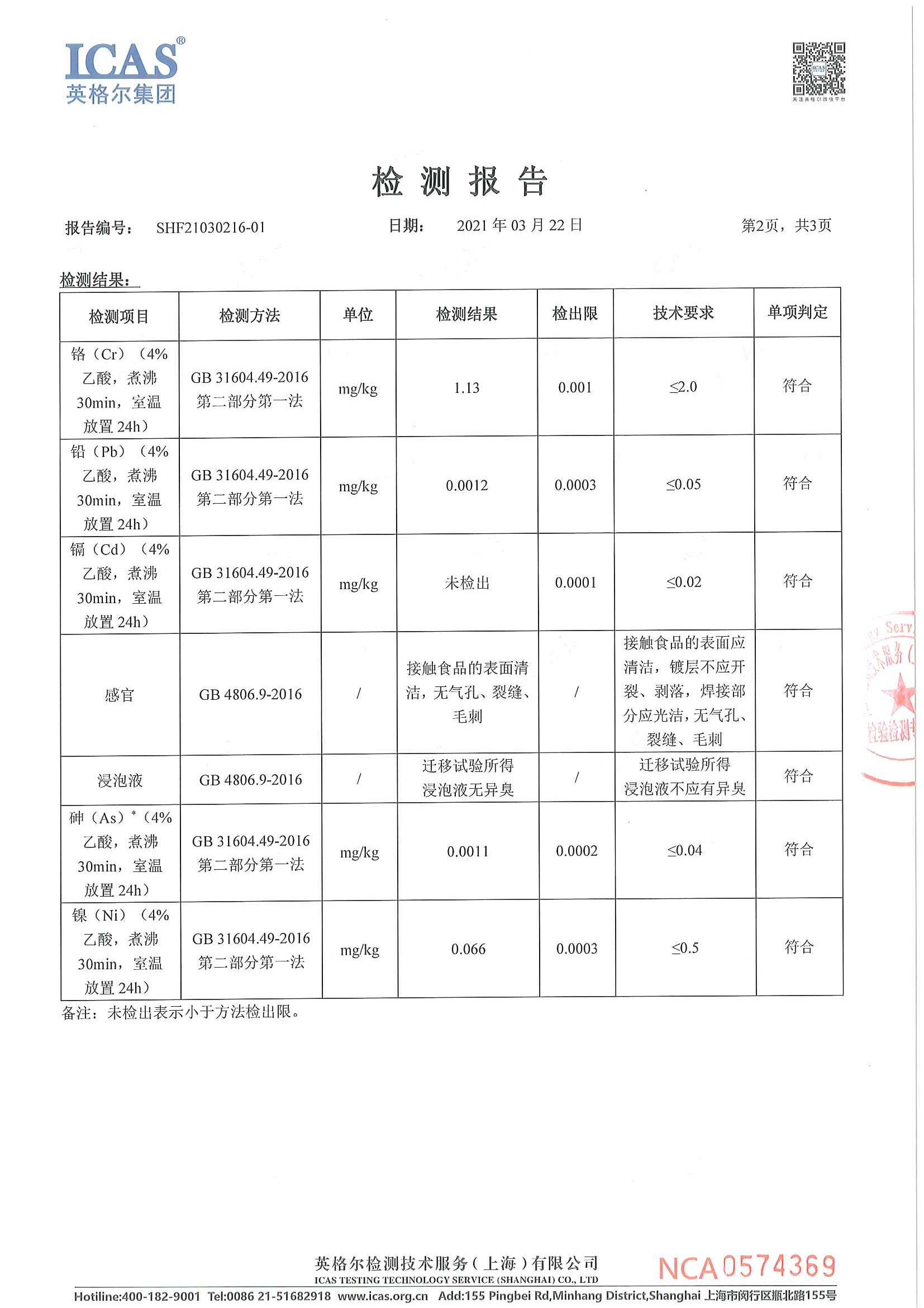 GB 4806.9-2016食品安全国家标准食品接触用金属材料及制品 检测报告