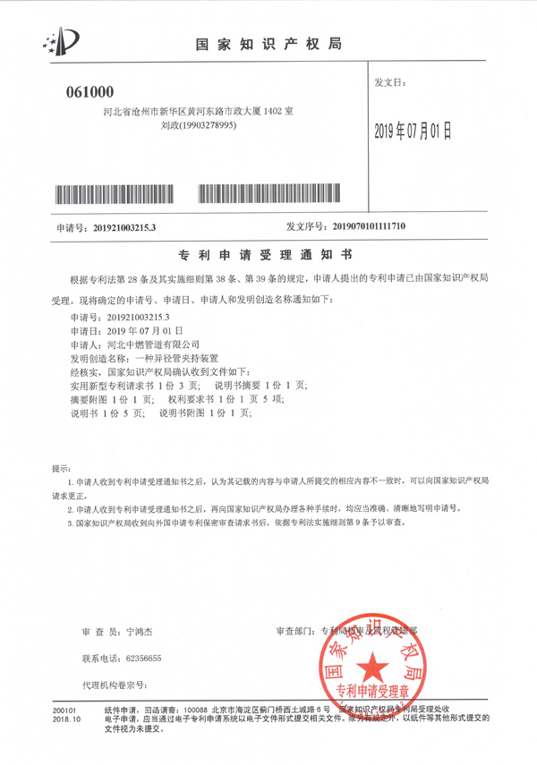 “一种三通固定夹具”专利申请受理通知书